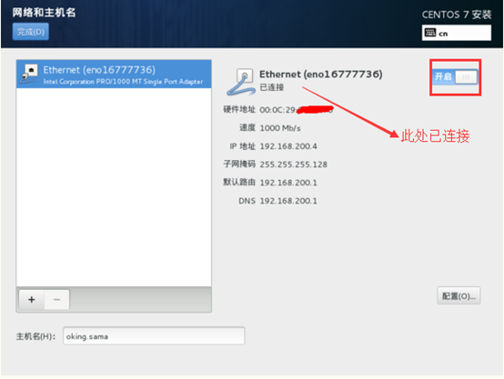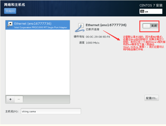20、点击网络和主机名进去后把网线打开如下: