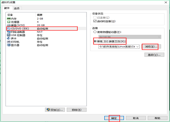 15、在虚拟机设置中,找到CD/DVD(IDE),在右边选择“使用ISO映像文件”,找到自己下载好的CentOS ISO镜像文件即可。