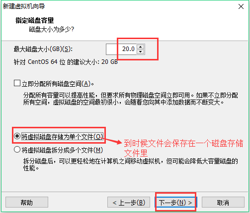 12、分配磁盘大小,选择将虚拟机磁盘存储为单个文件