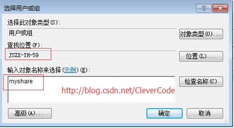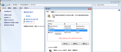 3)查看myshare的域。依次:控制面板\所有控制面板项\用户帐户。管理用户。可以看到域为:JSZX-YH-59。