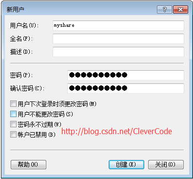1) 在ip:10.4.35.77的windows机器上新建用户。这里新建用户名:myshare,密码:myshare123。
