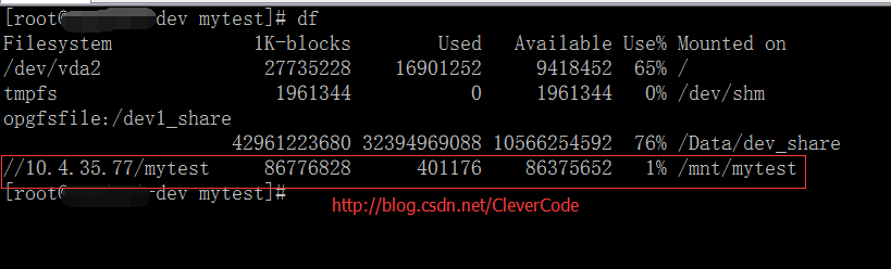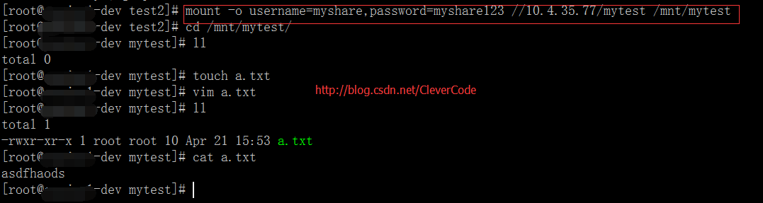 # mkdir /mnt/mytest # mount -o username=myshare,password=myshare123 //10.4.35.77/mytest /mnt/mytest
