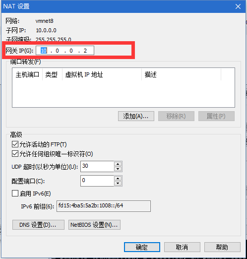 GATEWAY=10.0.0.2 #添加网关,根据VMware 软件‘虚拟网络编辑器'中的子网配置