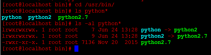 可以看到可执行文件python指向python2,python2又指向python2.7也就是说Python命令执行的系统预装的Python2.7。