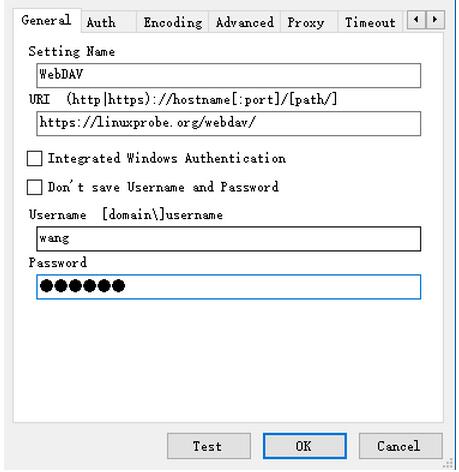 [5]在“设置名称”字段中输入任何名称,并在“uri”字段中输入[服务器名称/ webdav目录],并输入用户名和密码