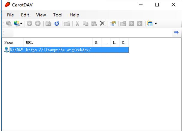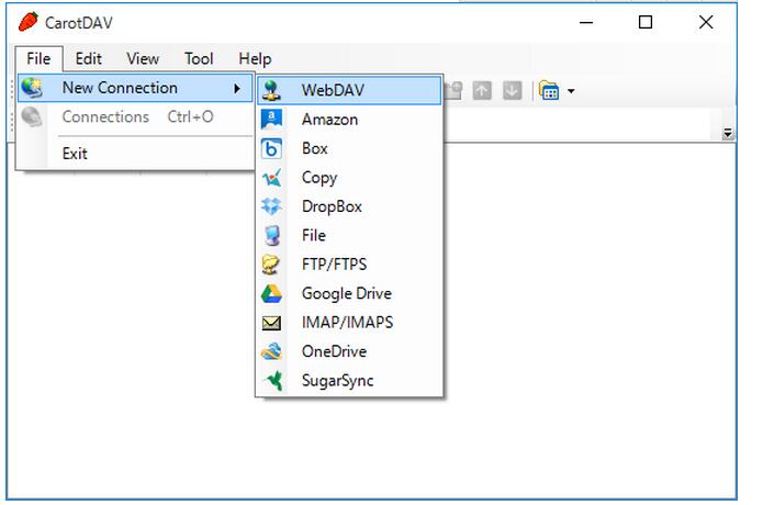 下载“carotdav”,这是一个免费的webdav客户端,从以下网站⇒ ,下载后,安装并启动carotdav,然后显示以下屏幕,单击“文件”按钮并选择“webdav”。
