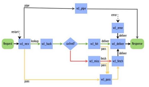 1)、varnish从客户端接收请求后,由vcl_recv状态引擎处理,不能识别的请求将会通过参数pipe交给vcl_pipe状态引擎,需要查找缓存的请求通过lookup参数将会交给vcl_hash状态引擎,无需缓存的数据通过参数pass将会交给 vcl_pass状态引擎;