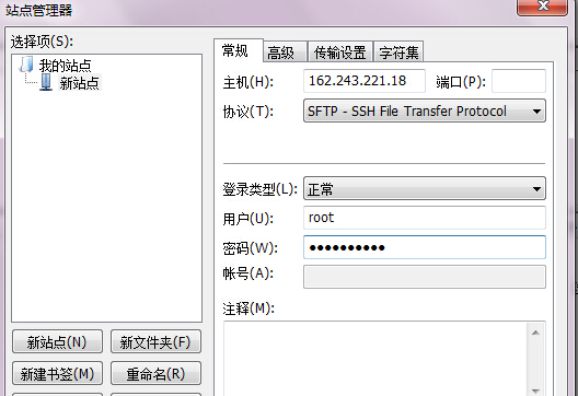 这样就把wordpress搞妥了,不过有些同学可能对命令操作有点恐惧,在windows下可以用filezilla软件,来把本地的文件上传到vps中。filezilla在文件的站点管理器中,选择新建站点,配置界面的协议选择sftp。