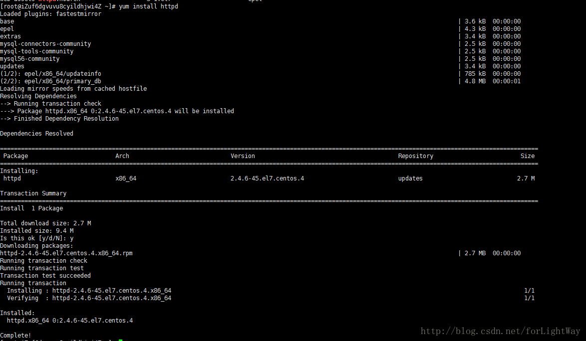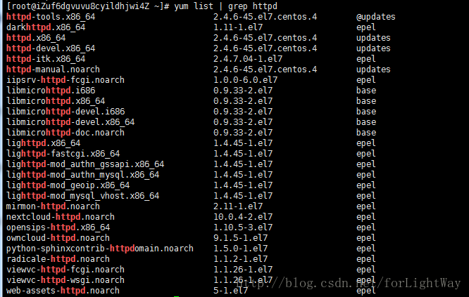 如果你想确认是否卸载干净,可以用list命令列出已经安装的查看下(卸载的第一步)。我们这里就不做这不操作了,我们直接用列出yum 仓库里面的httpd项,命令如下: