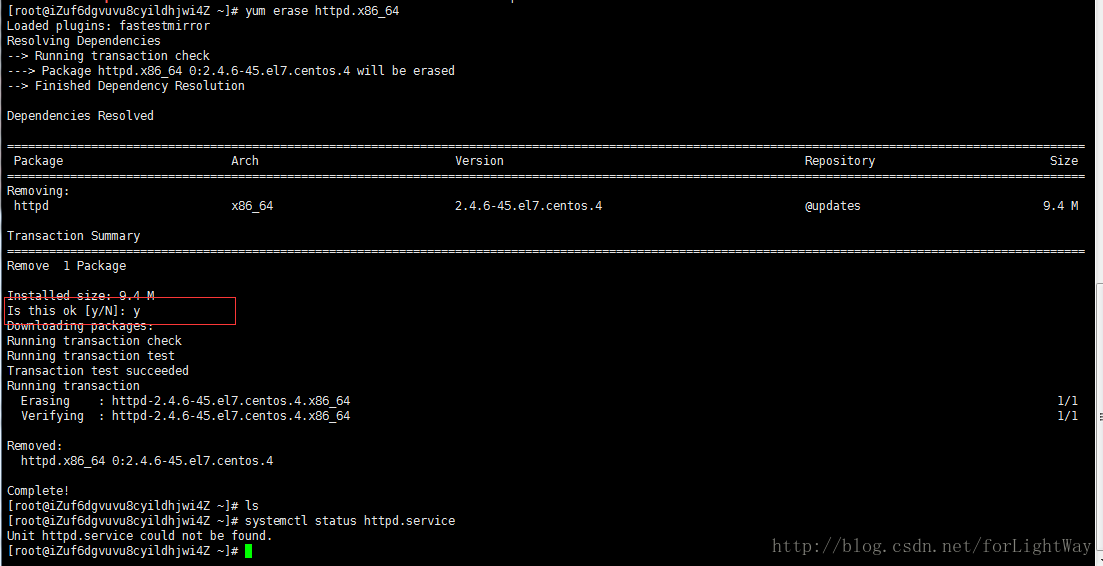 # yum erase httpd.x86_64