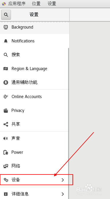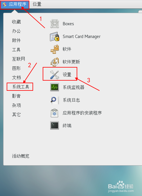 单击左上角的应用程序->系统工具->设置