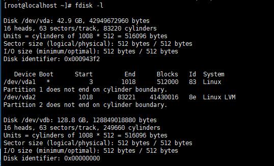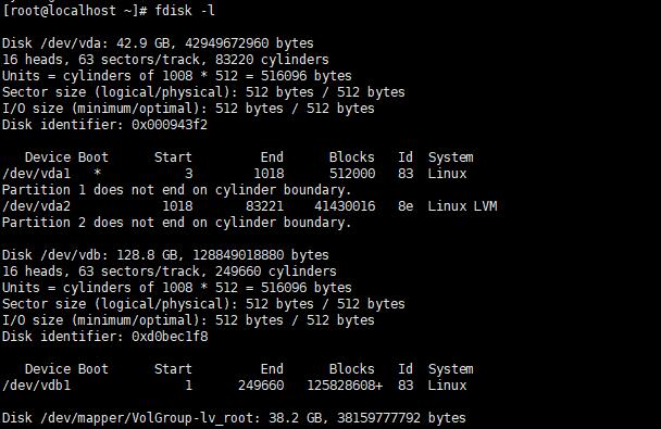 输入fdisk -l然后回车,我们可以看到/dev/vdb/数据盘有128.8GB没有挂载(注意红色文字,我在网上看别的教程显示的是/xvdb/,而我这里显示的是vdb,运行命令时根据实际显示操作。)