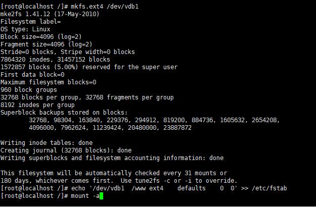 echo “/dev/vdb1 /www ext4 defaults 0 0” >> /etc/fstab