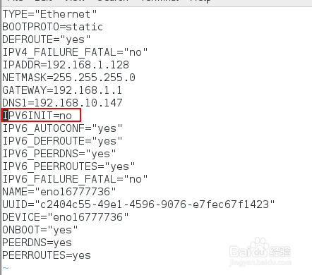 编辑/etc/sysconfig/network-scripts/ifcfg-eno16777736,确保IPV6INIT=no,ifcfg-eno16777736是根据自己机器的,实际网卡信息来看,不是固定的,如下图所示: