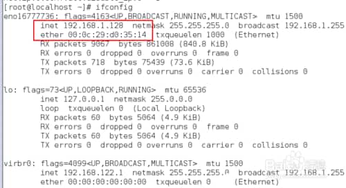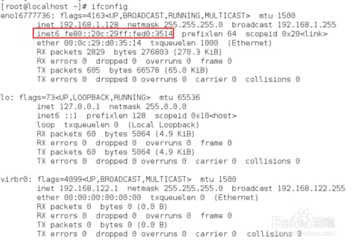 使用ifconfig命令查看网卡信息,如果出现inet6 fe80::20c:29ff:fed0:3514,说明机器开启了ipv6,如下图所示: