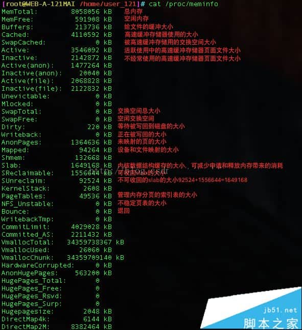 由输出可知,此系统共7.8G内存,系统空闲内存还有621M,其中,Buffer Cache占用了210M,Page Cache占用了4056M,由此可知系统缓存了很多的文件和目录,而对于应用程序来说,可以使用的内存还有4888M,当然这个4888M包含了Buffer Cache和Page Cache的值。在swap项可以看出,交换分区还未使用。所以从应用的角度来说,此系统内存资源还非常充足。