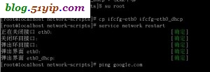 上图中我把自动获取IP的配置文件ifcfg-eth0作了备份,名子为ifcfg-eth0_dhcp,重新启动网络的时候,这个文件依然被执行了,开始的时候,我并没注意到这一点,等我ifconfig查看网络的时候,发现我做的修改根本没有启作用,并且/etc/resolv.conf里面做的修改又被盖了。所以备份的时候,前面不要带有ifcfg-eth0