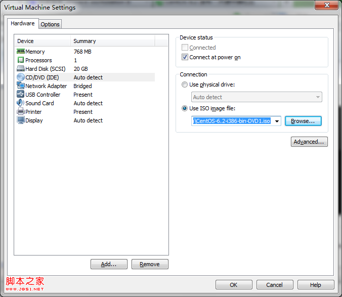 下载完成后得到两个安装镜像文件(CentOS-6.2-i386-bin-DVD1、CentOS-6.2-i386-bin-DVD2),安装系统只用到第一个镜像文件(CentOS-6.2-i386-bin-DVD1),另一个镜像文件(CentOS-6.2-i386-bin-DVD2)是附带的软件包。为了方便演示,我用VMware workstation 8来进行安装。具体的硬件配置
