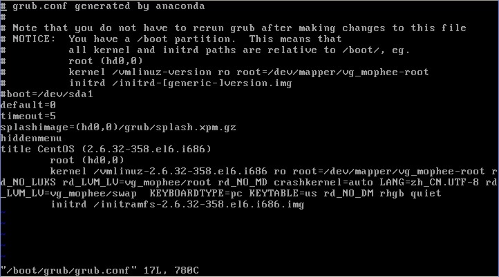 解决方案:修改引导程序配置 /boot/grub/grub.conf