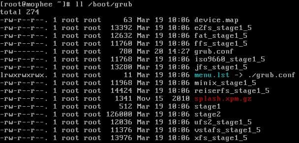 该目录下有个 grub.conf 文件,要修改的就是它了。有些人修改 menu.lst,如图所示 menu.lst 是连接到 grub.conf 的,也就是说修改它其实还是在修改 grub.conf。