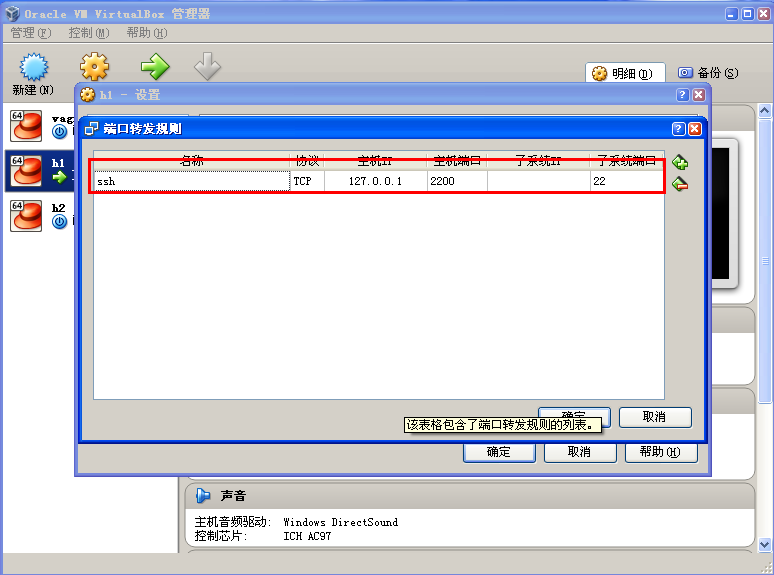 打开virtualbox的设置窗口 ->网络->网卡1 启用网络连接-> 连接方式:NAT->接入网线->端口转发,设置如下