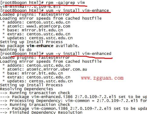 2. 如果缺少了其中某个,比如说: vim-enhanced这个包少了,执行:yum -y install vim-enhanced 命令,它会自动下载安装。