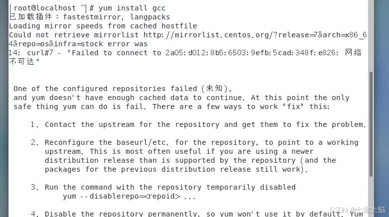 有些同学在安装完CentOS操作系统后,在系统内安装比如:gcc等软件的时候出现这种情况:(网络不可达)