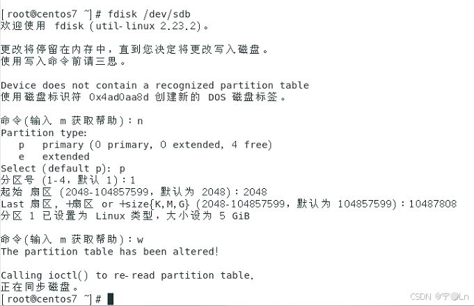 n->p->1->输入分区的起始位置回车->输入分区的终止位置回车->w