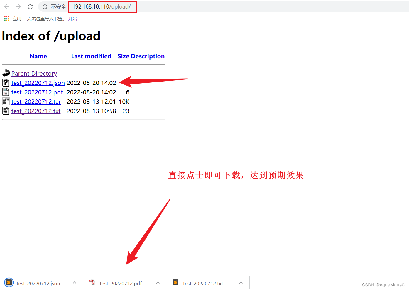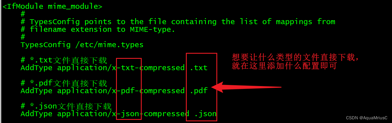 # 编辑本地配置文件,将预期直接下载的文件扩展名配置上 # *.txt文件直接下载 AddType application/x-txt-compressed .txt # *.pdf文件直接下载 AddType application/x-pdf-compressed .pdf # *.json文件直接下载 AddType application/x-json-compressed .json # 重启httpd服务 [root@centos7 ~]# systemctl restart httpd.service # 清理浏览器缓存