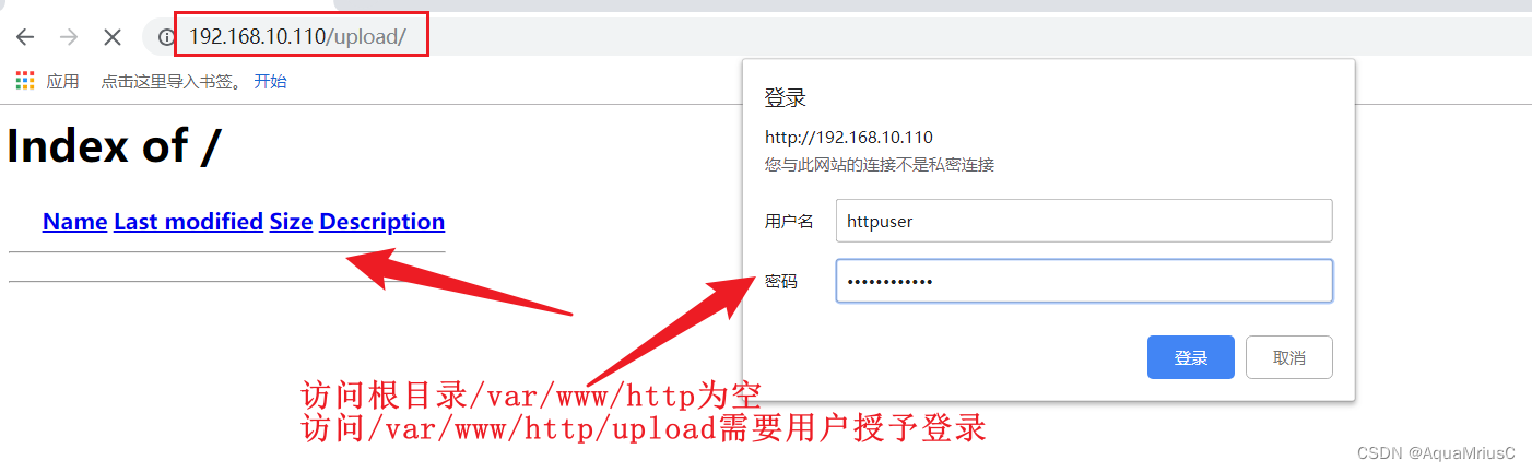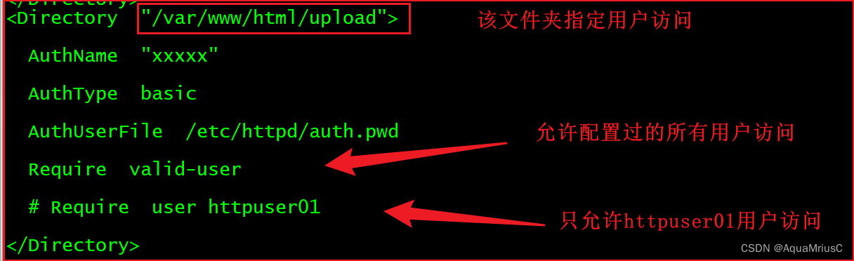 # 添加访问用户并设置密码 [root@centos7 ~]# htpasswd -c /etc/httpd/auth.pwd httpuser New password: # 密码输入不显示,正常输入后直接按回车就行 Re-type new password: Adding password for user httpuser [root@centos7 ~]# # 添加用户访问权限配置,直接在配置文件中新增以下内容即可 [root@centos7 ~]# vim /etc/httpd/conf/httpd.conf <Directory "/var/www/html/upload"> AuthName "xxxxx" AuthType basic AuthUserFile /etc/httpd/auth.pwd Require valid-user # Require user httpuser01 </Directory> # 重启httpd服务 [root@centos7 ~]# systemctl restart httpd.service