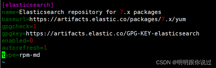[root@bogon yum.repos.d]# cat elasticsearch.repo # 输入以下内容 [elasticsearch] name=Elasticsearch repository for 7.x packages baseurl=https://artifacts.elastic.co/packages/7.x/yum gpgcheck=1 gpgkey=https://artifacts.elastic.co/GPG-KEY-elasticsearch enabled=0 autorefresh=1 type=rpm-md