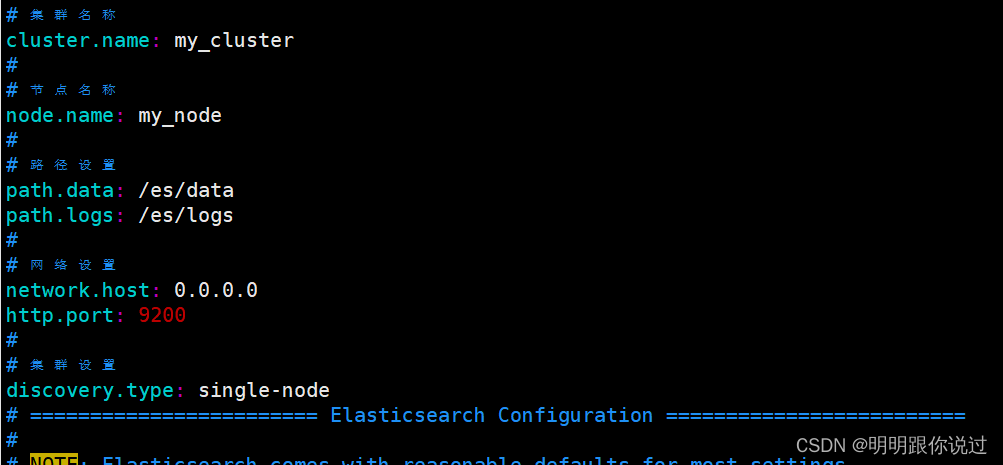# 集群名称 cluster.name: my_cluster # # 节点名称 node.name: my_node # # 路径设置 path.data: /es/data path.logs: /es/logs # # 网络设置 network.host: 0.0.0.0 http.port: 9200 # # 集群设置 discovery.type: single-node