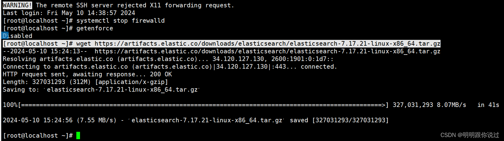 [root@localhost ~]# wget https://artifacts.elastic.co/downloads/elasticsearch/elasticsearch-7.17.21-linux-x86_64.tar.gz