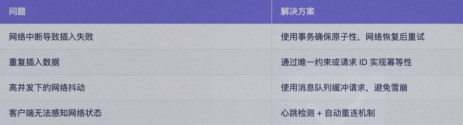 重试逻辑:在网络恢复后,客户端可以重试插入请求。