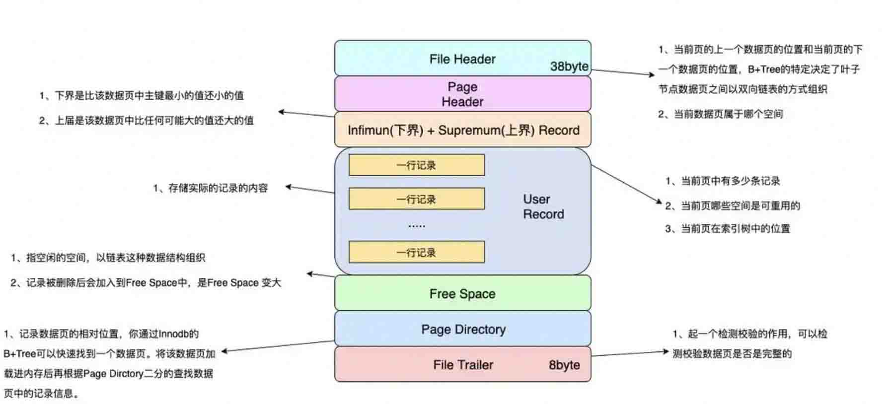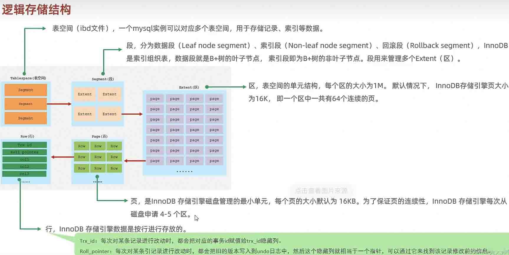 一张表的空间由页节点段、非页节点段、回滚段、和表空间组成。页节点段由多个区(1MB)组成,每个区由64个页(16KB)组成,每个页有多行组成。