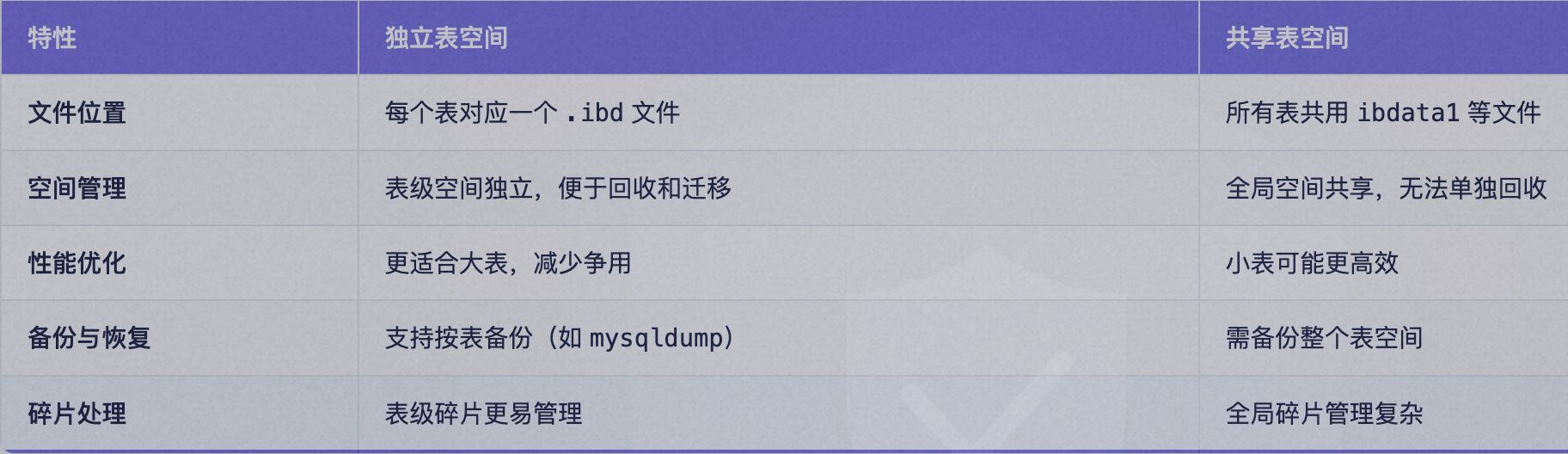 独立表空间文件(.ibd),每个独立表在磁盘上对应一个.ibd文件(test_table.ibd)