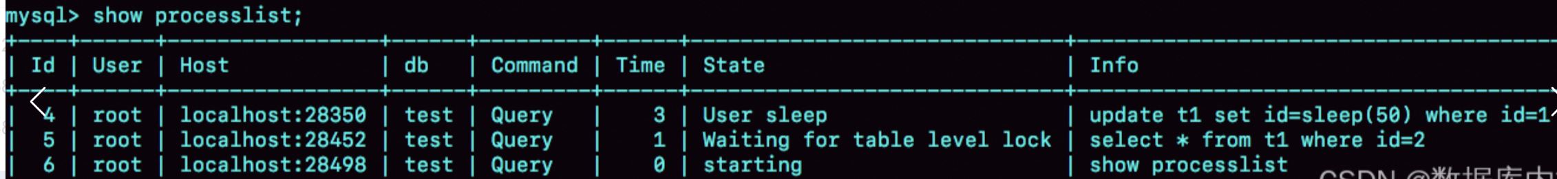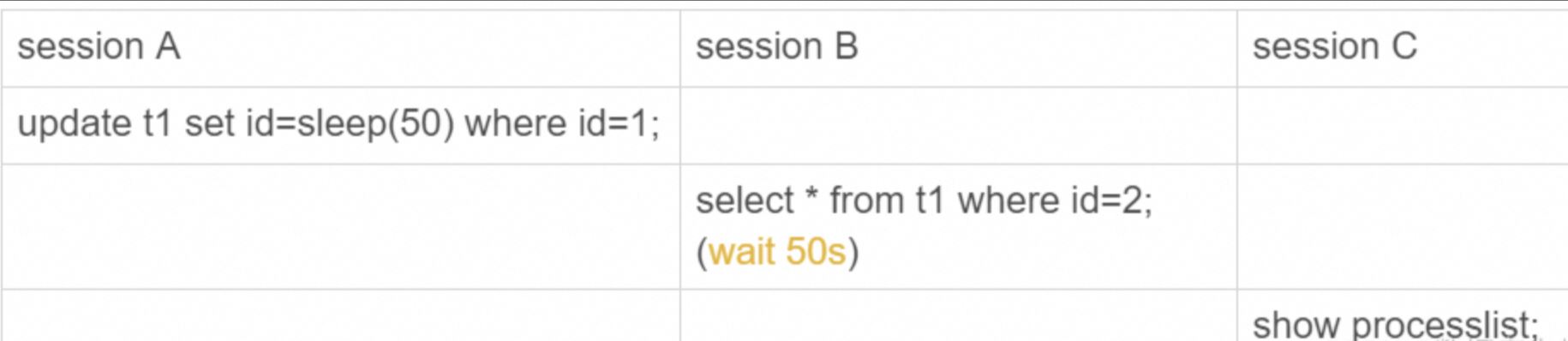 在这个执行序列里, session A的update语句要执行50秒, 在这个语句执行期间session B的查询会进入锁等待状态。 session C的show processlist 结果输出如下: