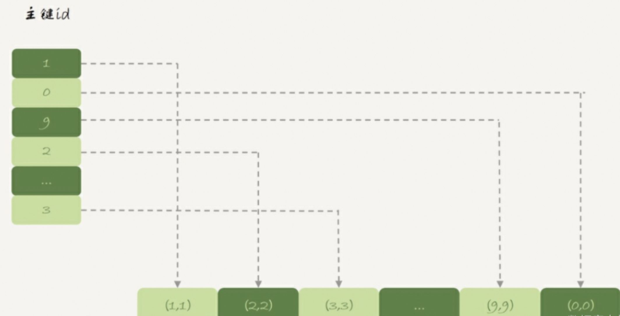 索引采用Hash的形式,存放主键id和指向数据的指针,而数据则按插入顺序存放。称这种数据组织方式为堆组织方式。
