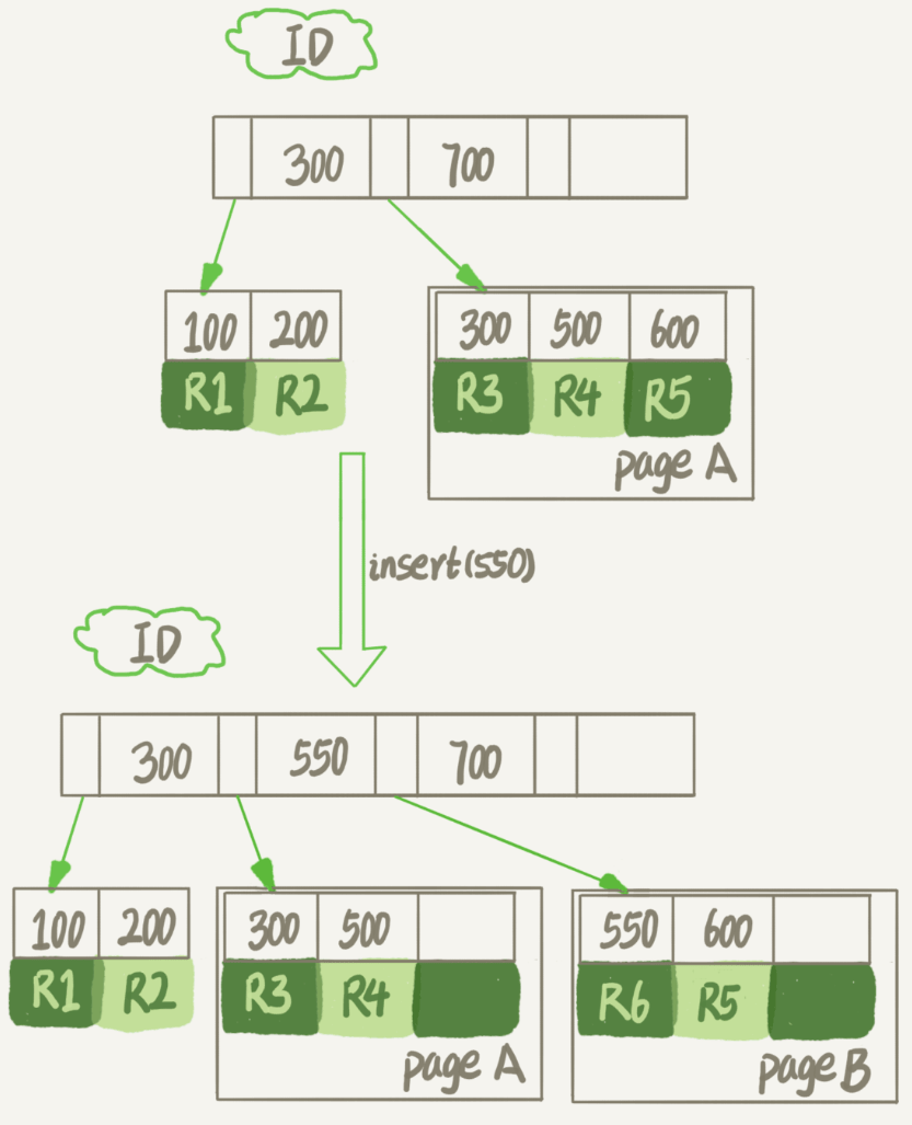 实际上不止删除数据会造成空洞,插入数据也会。如果数据的插入是随机的,可能造成索引的数据页分裂。比如在上面的索引中,假设page A已满,这时若要再插入一行数据ID=550: