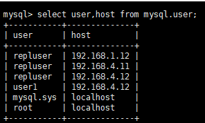 主服务器查看repluser帐号,已设置登录ip为从ip或%