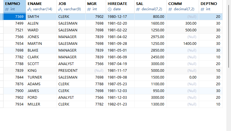 以上sql查询完之后,显示13条结果,KING这条数据没有显示(边界值无法查询),如果向解决边界值问题,需要使用连接查询