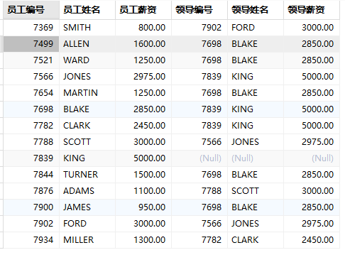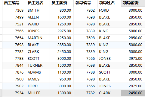 SELECT e1.empno '员工编号', e1.ename '员工姓名', e1.sal '员工薪资', e2.empno '领导编号', e2.ename '领导姓名', e2.sal '领导薪资' FROM emp e1, emp e2 WHERE e1.mgr = e2.empno;