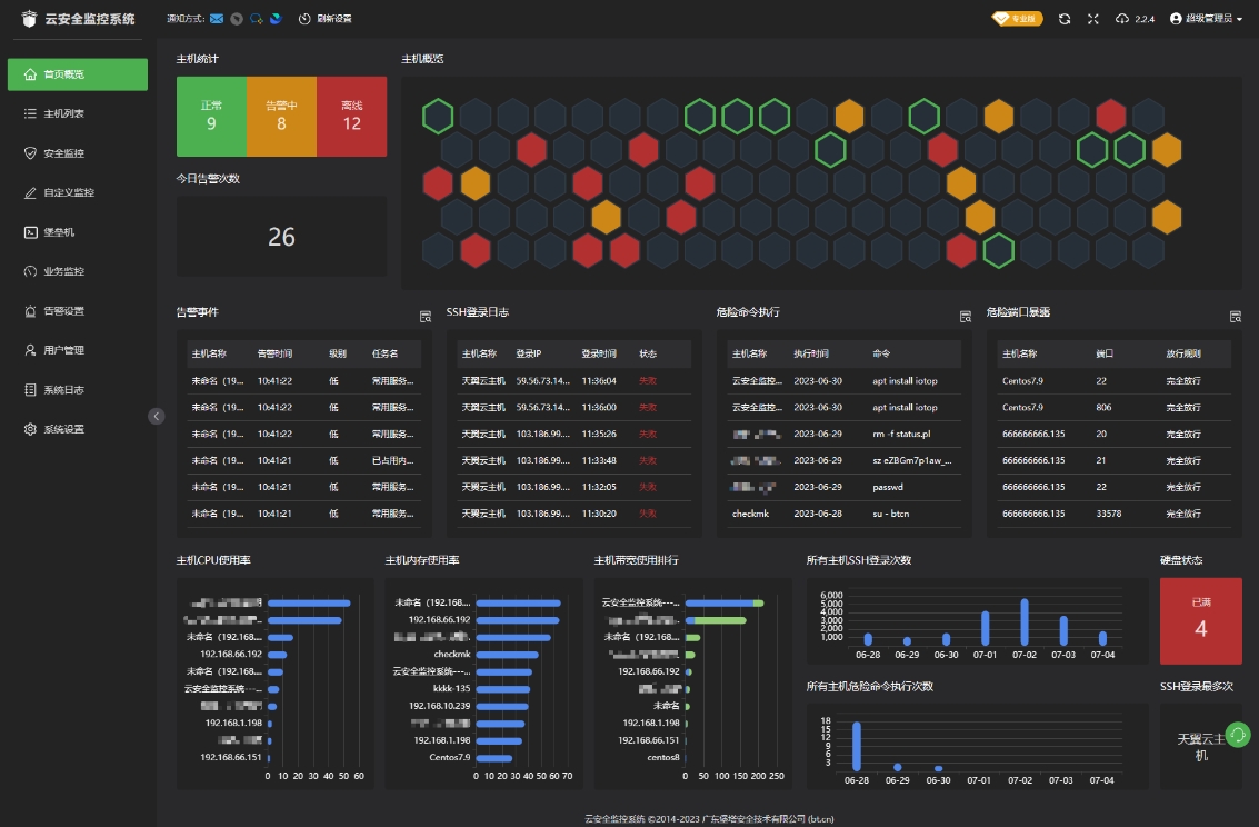 宝塔面板云安全监控系统可以全面监控服务器的各项情况,包括添加服务器、管理服务器控制面板、SSH终端、主机概览、基础监控、进程监控、端口监控、日志监控、防火墙监控、系统监控。