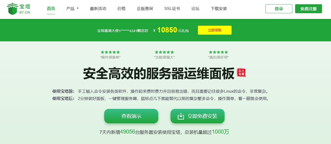 是一款常用的服务器管理工具,支持Windows和Linux系统,其功能丰富,包括网站管理、数据库管理、FTP管理、安全防护等等,帮助用户轻松地管理和维护服务器,使服务器更加安全、稳定、高效地运行,有需要的朋友可以点击下方官网地址进行下载。