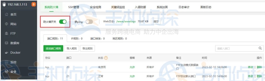 一、登录宝塔面板,在左侧的菜单栏中,选择“安全”>>“防火墙”这个选项,点击防火墙开关按钮,即可开启或关闭防火墙。