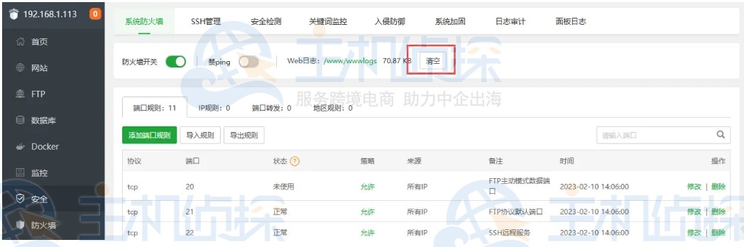 2.点击清空按钮,即可清空web日志,日志存放的目录为:/www/wwwlogs。