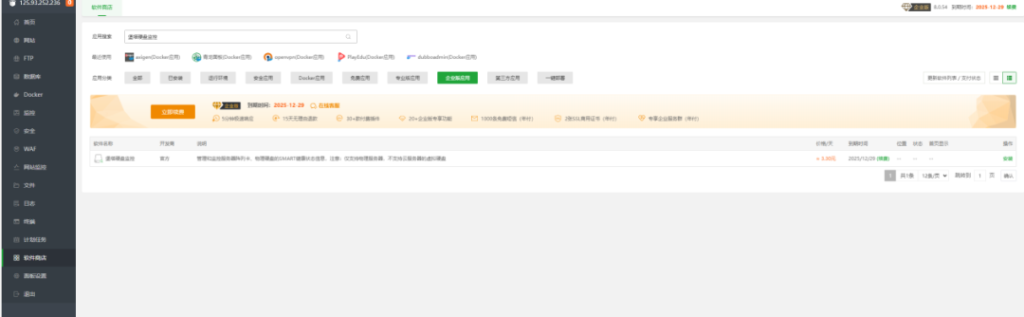 登录宝塔面板,在软件商店中搜索“堡塔硬盘监控 ”点击右侧的“安装”,点击右上角“立即安装”即可安装。