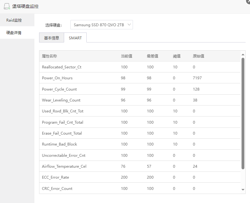 堡塔硬盘监控插件包含RAID阵列识别,它可以检测查看硬盘故障、阵列状态和性能,同时可以用于检测硬盘的健康状态和性能参数。该插件读取和解析 SMART 的数据,它可以提供硬盘的各种指标,如温度、错误率、剩余寿命等,并根据这些指标提供警报和建议,帮助管理员及时发现和解决硬盘问题,以防止数据丢失和系统故障。